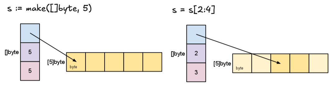 使用 s[2:4] 进行切片截取的时候,底层并不会发生数组的拷贝,而是直接引用原数组中的地址,即 s[2:4] 和 s 指向的是同一个底层数组。
