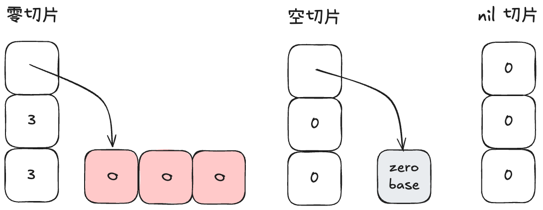 零切片很好理解,就是底层元素全是零值的切片。我们接下来主要看空切片和 nil 切片的区别,以及为什么要这么做。