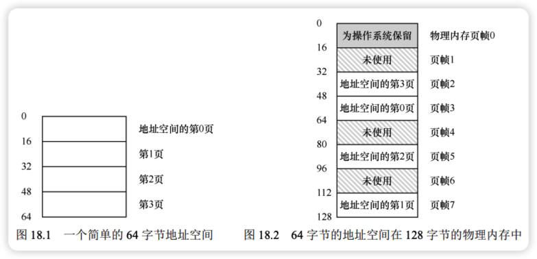 假设一个 64 字节的地址空间,包含 4 个 16 字节的页(VP 0~3)。物理内存由多个页帧(Page Frame)组成。