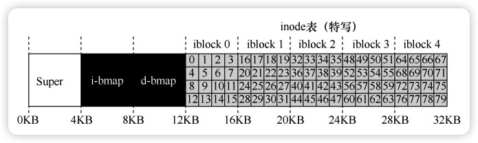 磁盘被划分为固定大小的块(如 4KB)。VSFS 的磁盘布局包含以下区域: